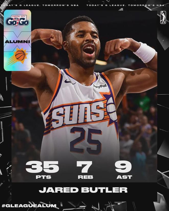 单场35+7+9,而且还是25岁当打之年,贾里德-巴特勒居然连正式合同都拿不到。今年季前赛,他场均出战21分钟,得到15.5分3.3篮板4.3助攻1.8抢断0.5盖帽2失误。投篮命中率47.1%,三分命中率35.3%,罚球命中率66.7%。